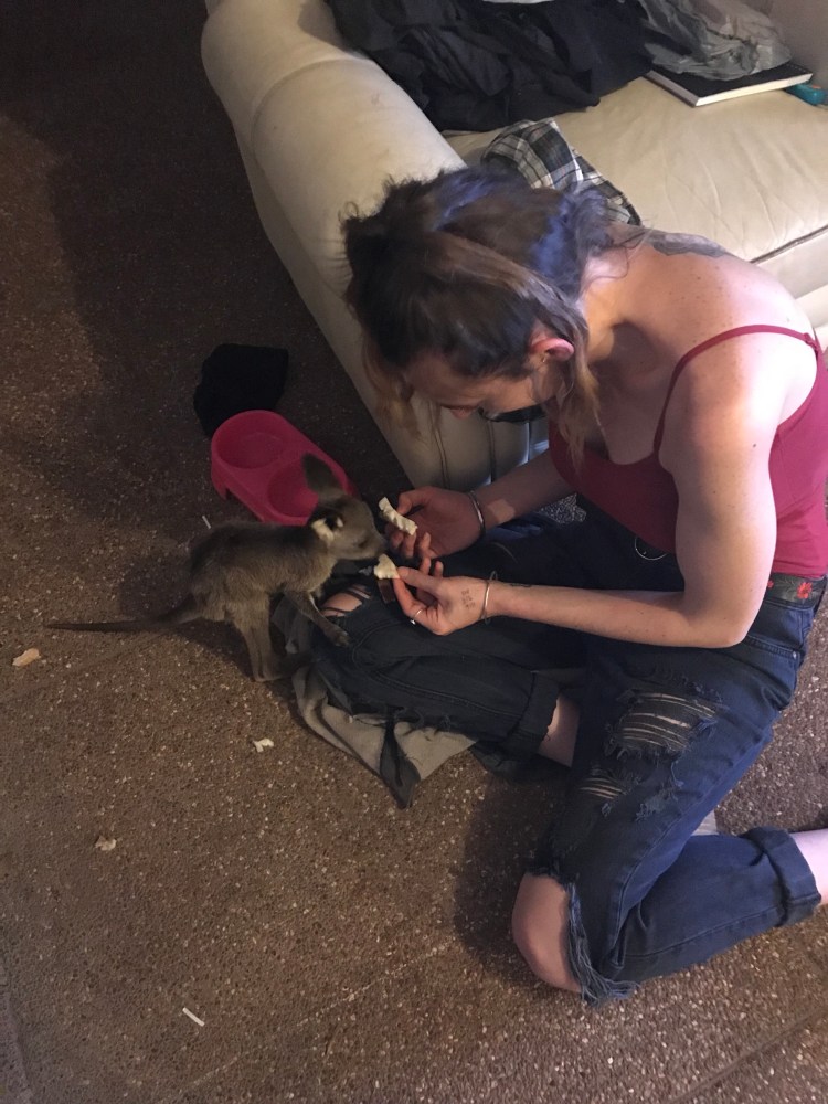 After arriving home and seeing my new little friend I couldn’t help but feel a little heart broken. This little baby joey was in shock and barely moved or even stood. Trying our hardest to keep him warm he was propped up in his pouch by the fire where he slept all night without a peep! You could imagine by morning with no noice or movement I was assuming the worse. Upon awaking him things looked awful. He was hardly breathing and still refused to stand but at the same time seemed like he had just needed a big nap, probably from being in the wild so small and not being able to sleep.